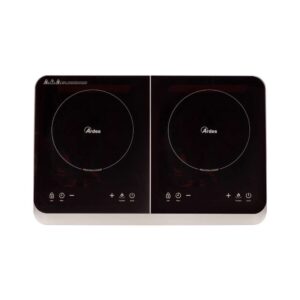 Επαγωγική κουζίνα με δύο ζώνες μαγειρέματος, ρυθμιζόμενη θερμοκρασία, χρονοδιακόπτη, χειριστήρια αφής και ψηφιακή οθόνη.