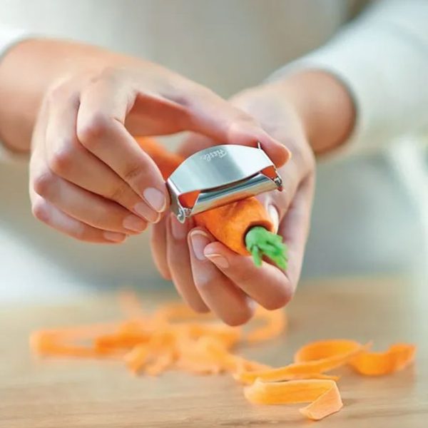Το έξυπνο εργαλείο διαθέτει εργονομική βάση από ανοξείδωτο ατσάλι που μπορεί να πιαστεί με τον αντίχειρα και τον δείκτη. Αυτό καθιστά τη φαρδιά λεπίδα από υψηλής ποιότητας ατσάλι μαχαιριού ιδιαίτερα εύκολη στην οδήγηση. Και αυτό όχι μόνο εξασφαλίζει μεγαλύτερη ασφάλεια, αλλά και μεγαλύτερη ακρίβεια κατά το ξεφλούδισμα.