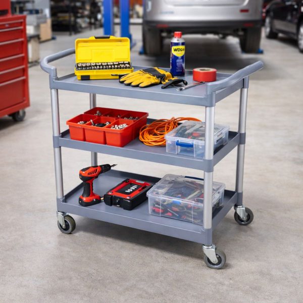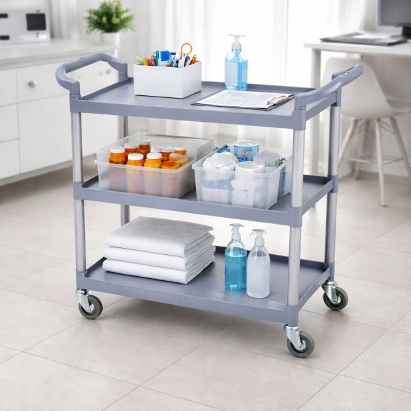 Τριώροφο Τρόλεϊ μεταφοράς από υψηλής ποιότητας πλαστικό με ενισχυμένες μεταλλικές κολώνες για μέγιστη σταθερότητα.
