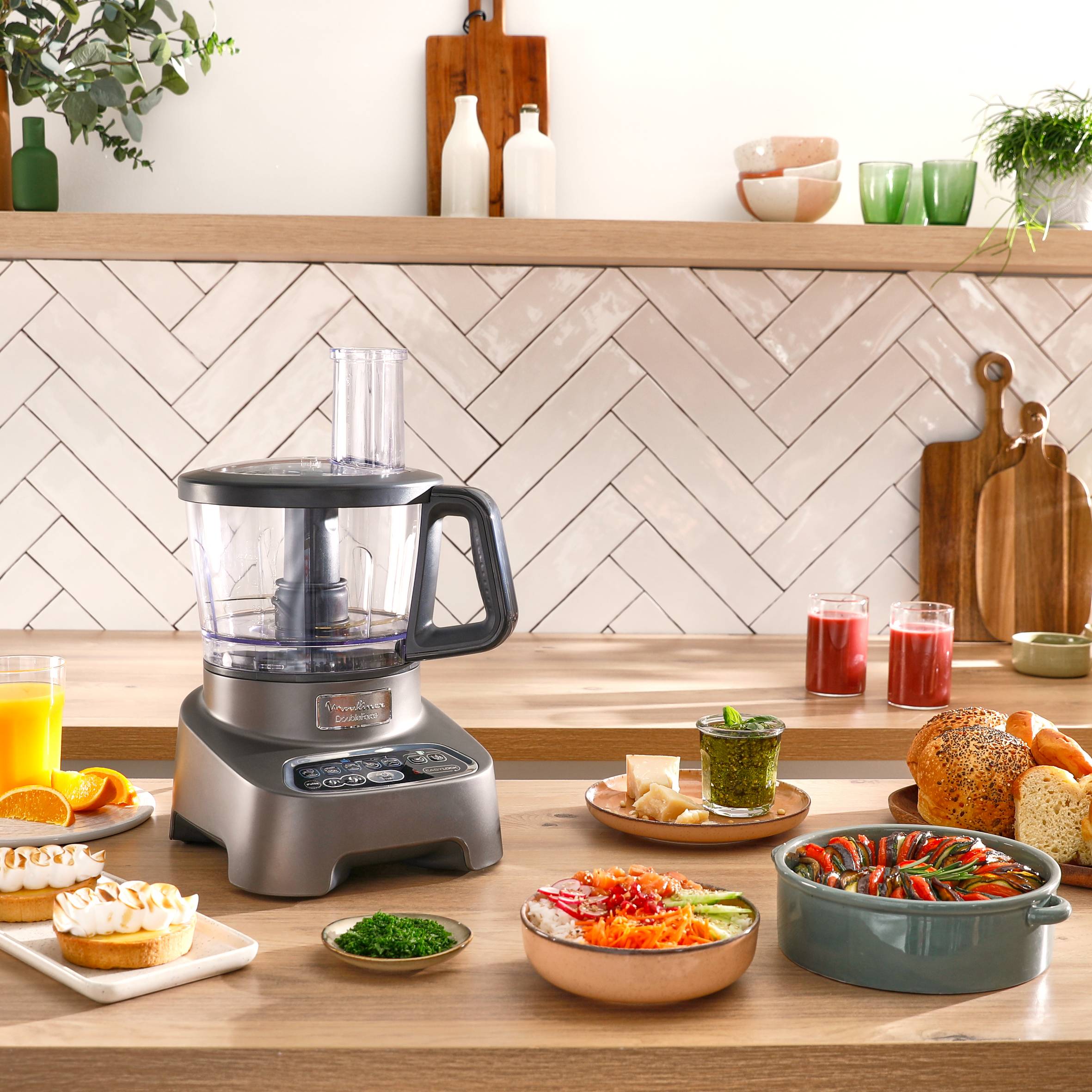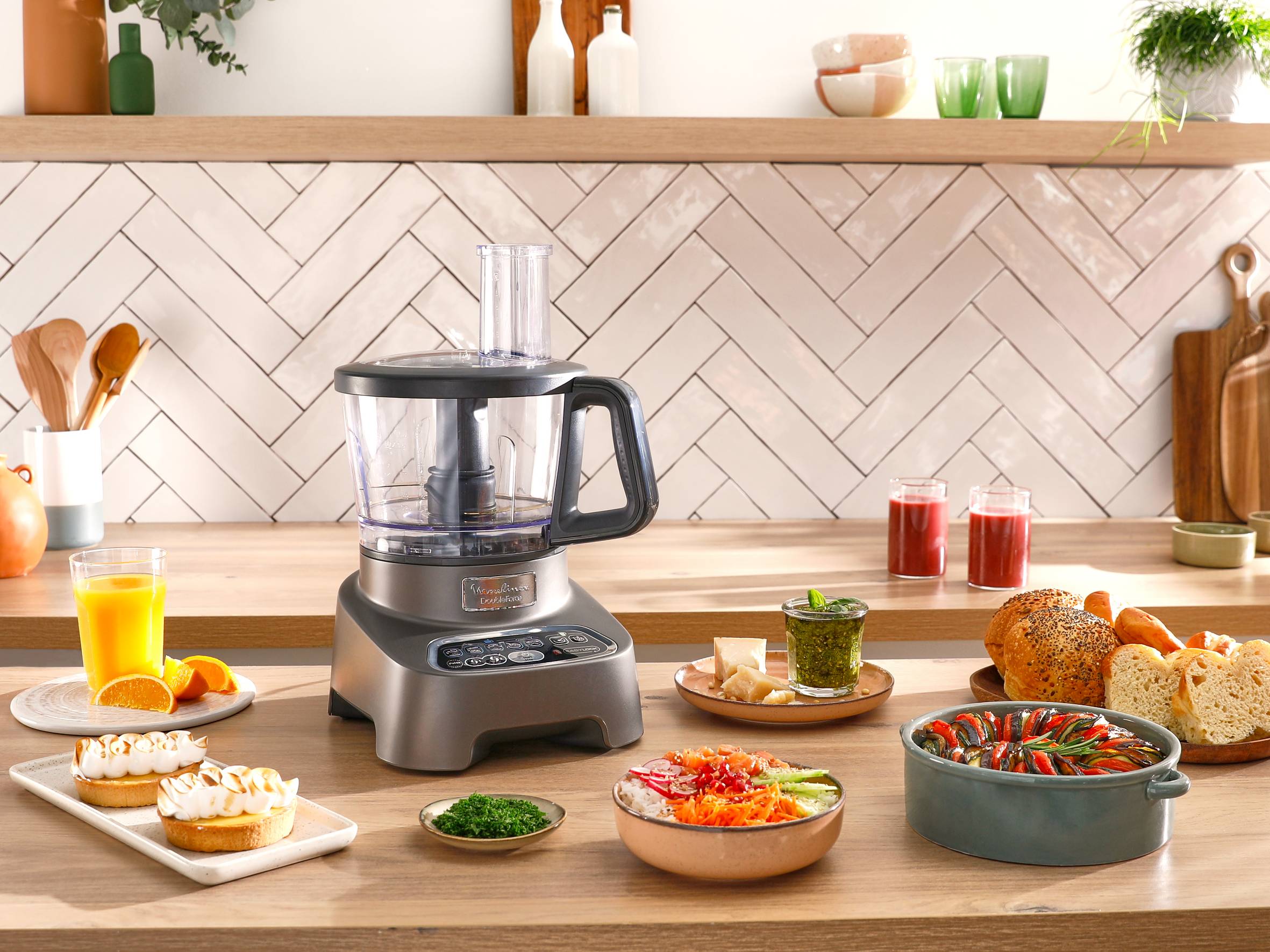 Η χρυσή τομή στα χέρια σας! Το πολυλειτουργικό ρομπότ Moulinex DoubleForce είναι εξοπλισμένο με δύο ξεχωριστές εξόδους κινητήρα για να σας προσφέρει μια εξαιρετική συσκευή, της οποίας η ταχύτητα και η ισχύς θα καλύψουν όλες τις ανάγκες σας. Με κινητήρα 1000W, αυτό το στιβαρό, υψηλής χωρητικότητας πολυλειτουργικό ρομπότ που προσφέρει δέκα ευέλικτα αξεσουάρ σε συμπαγές και βολικό μέγεθος συνδυάζεται με ένα μπλέντερ για να φτιάξετε νόστιμα smoothies. Οι πιθανότητες είναι ατελείωτες!