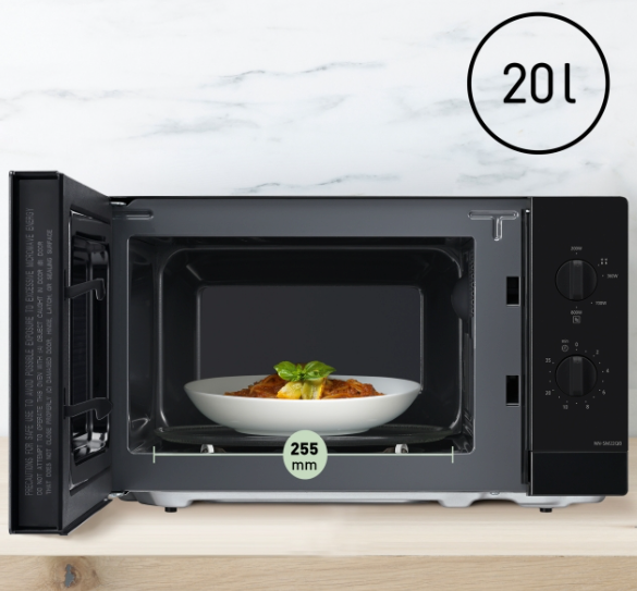 Με μόλις 44x33x25 εκ., χωράει ακόμα και στις πιο μικρές κουζίνες σου. Και με τα 20 λίτρα χωρητικότητα και το γυάλινο δίσκο 25,5 εκ., χωράει πιάτα μεγάλα και μικρά χωρίς πρόβλημα.